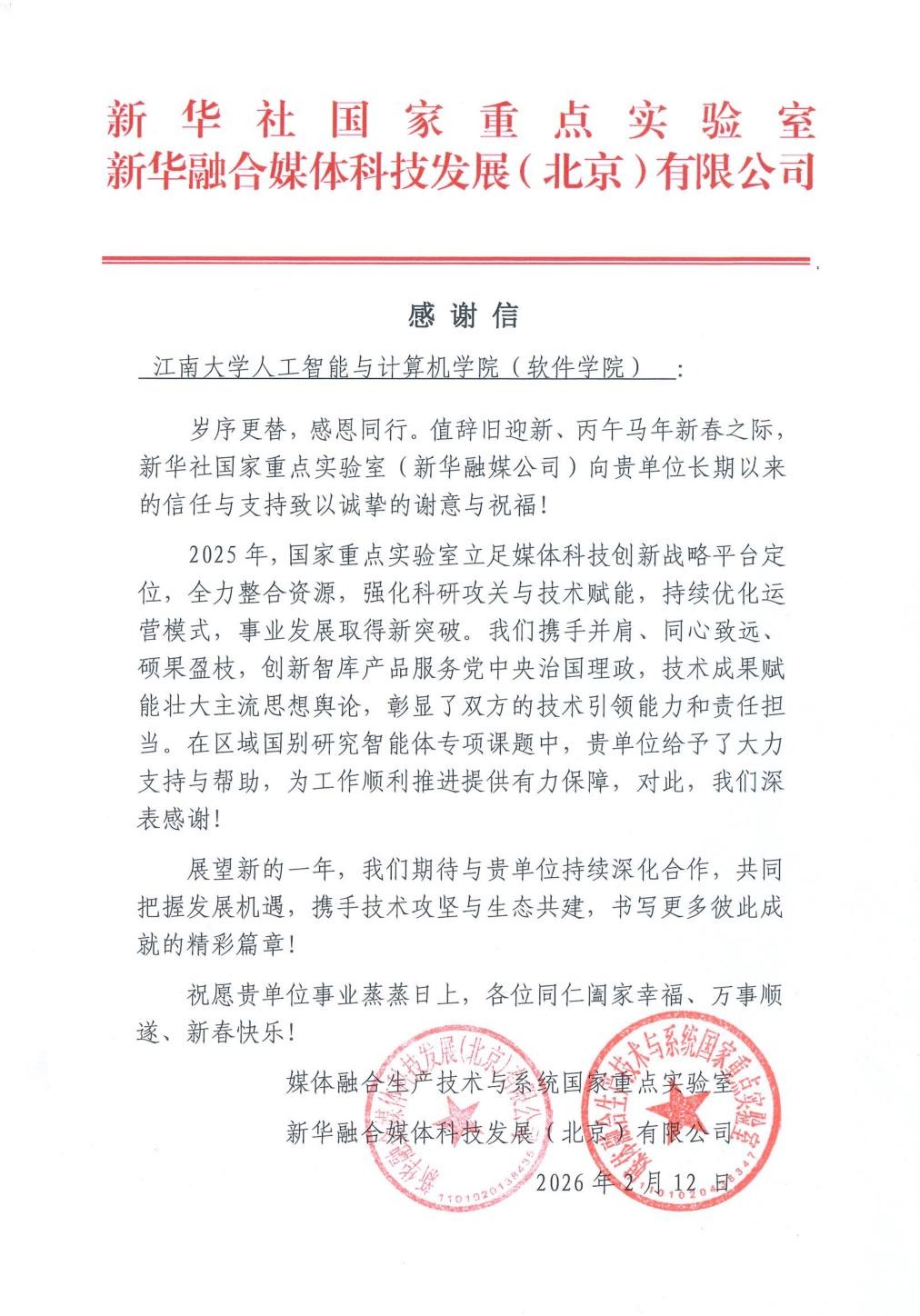 近日,江南大学人工智能与计算机学院(软件学院)收到来自媒体融合生产技术与系统国家重点实验室(新华融媒公司)的感谢信,对学院长期以来在科研合作、技术支撑等方面给予的大力支持表示诚挚感谢,并特别肯定了学院在“区域国别研究智能体”专项课题中的突出贡献。