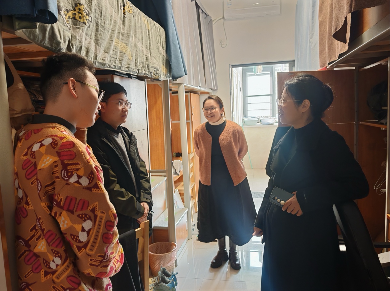 1月16日,学院党委副书记兼副院长王莉莉带领全体辅导员分组走访学生宿舍,与留校学生深入沟通,了解留校及返乡计划,倾听诉求、答疑解惑。针对留校学生强调宿舍用电、消防及财产安全,同时关注单人留校学生心理状态,承诺做好假期服务保障。
